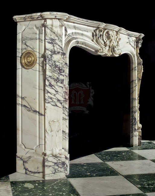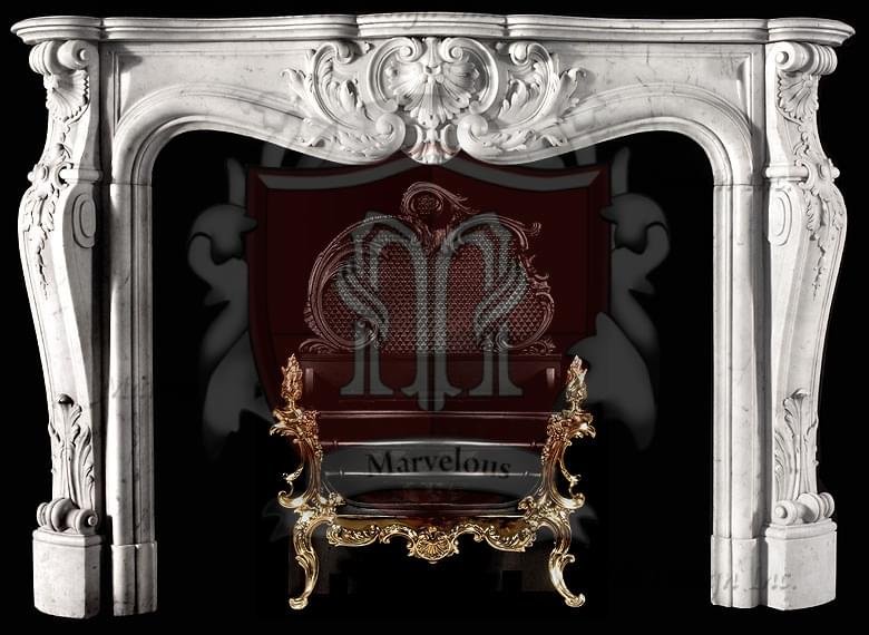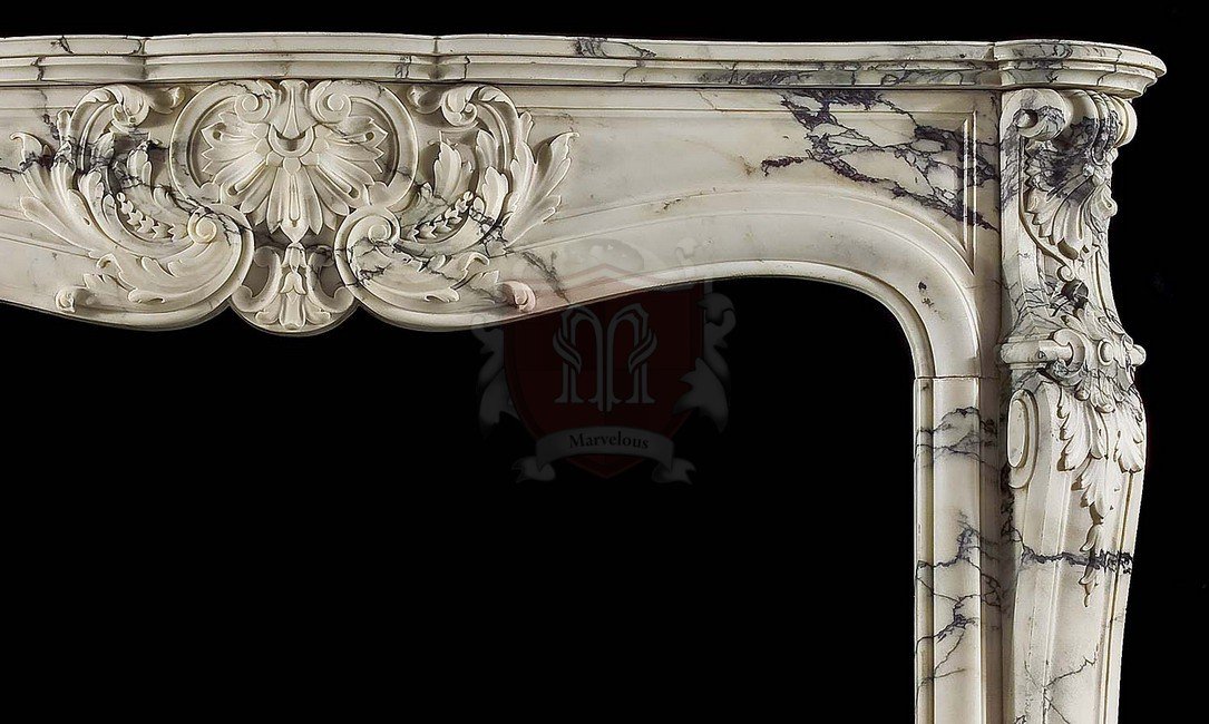 Antique 305 is an Italian marble mantel reproduction of the 18th century Louis XV. The precise carvings on the shelf help show the beauty of the marble mantels. The shelf has a unique design to display the meaning of nature with the flowers rising up from the middle of the frieze. With the thick shelf edges enhance the frieze beauty. The rigid tiger stripes are beautiful in every way and show that 2 different colors can be alike. The legs define the fireplace mantel as they are gorgeous to look at and support the mantle itself. Though this mantel may look heavy but is carved out from the back so it will not ruin your wonderful hardwood floor. The script carvings on the side of the legs are true beauty and show the antique history of this Old Italian marble fireplace mantle. On one side of the return is a cavity carved molding and in the middle is a bronze or brass plated draft to let in the air and suck out some as well. Under the mantle you can place a step raised hearth too. You can place an electric, gas or wood burning fireplace inside the marble mantels or add an over mantle if you desire.