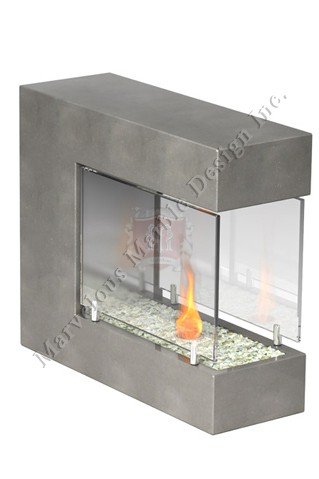 This gorgeous elegant free standing condo fireplace design would look great in your custom built loft in Vancouver, Seattle, and San Francisco. The modern, but sophisticated look it brings to your home is just astounding. The lifted break proof glass on the sides of the firebox look beautiful and because they are lifted above the frame, it lets out the warmth of the alcohol burning fire. One side of the firebox does not have glass of any sort on it, so you can always renew your alcohol containers easily. The alcohol containers are refillable and reusable and eco-friendly. They can run up to 3-4 hours straight. The stainless steel back plate doubles the size of the fire look, since there is only one alcohol container burning, but we can arrange for you to have more alcohol container fires if you wish. The sand (Rock) glass around the fire makes the fire eye catching and lets the fire have a natural feeling. C-Lounge is very light weight and vent free, so you can move it anywhere at any time. The glass around the firebox gives you more protection, than you not having it. You can change the color of the fireplace by making it 2 colors or you can change the stone.