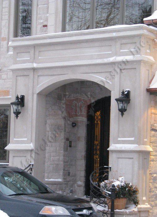 The Custom Portico Indiana Limestone Entrance with lights is a product that is made from a natural product, Indiana limestone. The stone contains a few distinguishable calcite streaks with open texture streaks. But unlike other limestone rocks mined from other places in the world, the Indiana limestone is a stone that is adaptable to various architectural styles. The calcite streaks and open texture streaks are not in large, noticeable concentrations. The stones used on this custom portico look very similar with no discernable natural patterns.