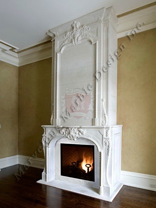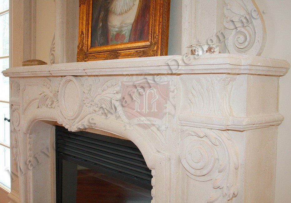 The Queen is french limestone mantel that is hand carved with an over mantle. Around the wood or gas burning fireplace is a trim; the trim consists of limestone or marble. The stone has been imported from Italy. The raised step hearth is made custom, to fit your living room perfectly. The mantle is in three parts when you order it, but with the precise measuring and carvings done by our masonry, when you install the limestone mantle, you would not be able to tell. On either side of the mantle is a door, around the door is a door surround made of custom stone. The over mantle can have a ceiling range from 9 to12 ft. The over mantle has many floral designs carved in and on the over mantle. In the middle of the over mantel is a picture frame molding around the carving that dense the inside of the mantle. On the top of the over mantle is the crown molding. The legs of the mantel are just gorgeous because of the floral and leave design. Everything on the mantel completes each other. The Queen is a hollow over mantle and mantel, so it will not ruin your wood floor