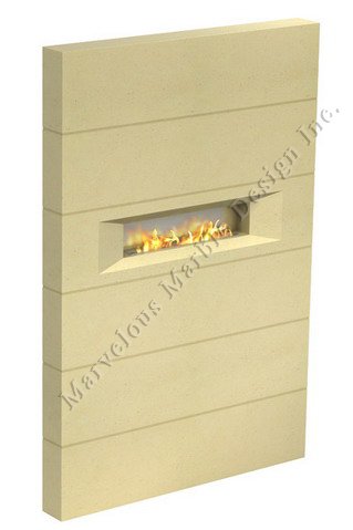 Selene wall mounted Condo or loft limestone fireplace can be customized to fit your ceiling height. It is an alcohol burning fireplace that runs for 3 to 4 hours. The alcohol containers are refillable. The alcohol containers are placed on the sand glass. Our masonry works so hard to bring you quality, that you can recognize it in this picture. Each section is separate, but on this fireplace, it is as if the entire fireplace is one piece. The tapered surround make the fireplace look better. For more protection, you could order the protective glass. The glass would look great with your fireplace, and give your entire limestone fireplace, protection from the heat. The back plate is stainless steel and gives you a beautiful reflection of the burning alcohol. The burning alcohol looks as if it were a real fire. Selene has a tapered surround. The fireplace fits in only one section. Every section can be 2 ft. high. The width of this fireplace is 1ft. The fireplace is in the middle of the wall unit. In front of the fireplace can be a couch, so you and your family can snuggle and keep warm during the winters. All of our condo fireplaces are vent free, so you don